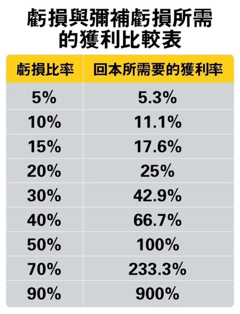 控制標的對帳戶的影響程度跟風險,輸到30%需要42%才會回本,輸到50%要一倍才會回本,所以帳戶10萬剩5萬,要翻回10萬有多難?
