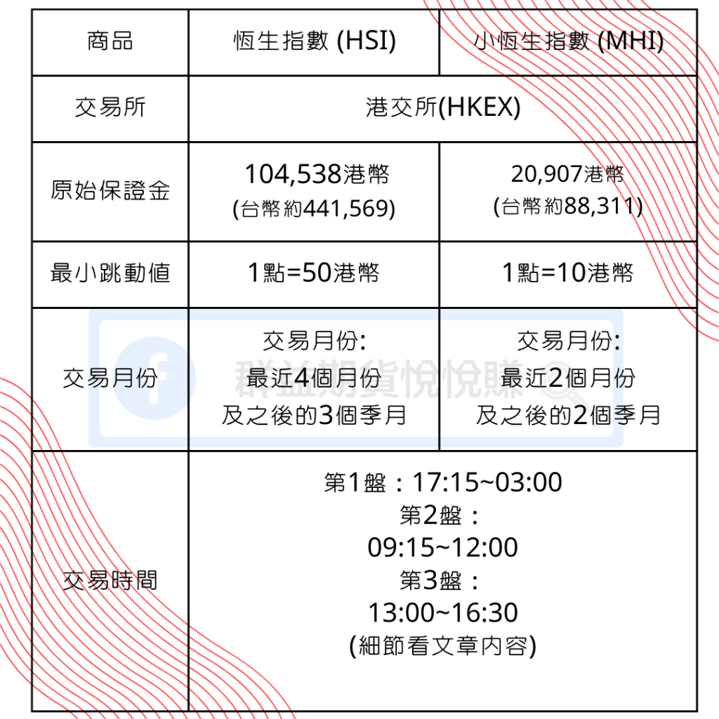 損益試算:假設我在 18500 點 買進 恆生指數期貨 一口,然後在 18800 點 平倉賣出,在不計算手續費的情況下, 我的獲利為 (18800 – 18500) × 50 = 15000 港幣(約當新台幣 60000 元)。